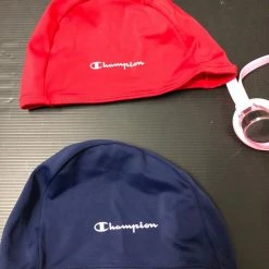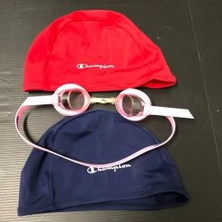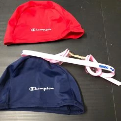 2 παιδικά σκουφακια Champion και ένα ζευγάρι γυαλιά κολυμβητηρίου Arena σε άριστη κατάσταση