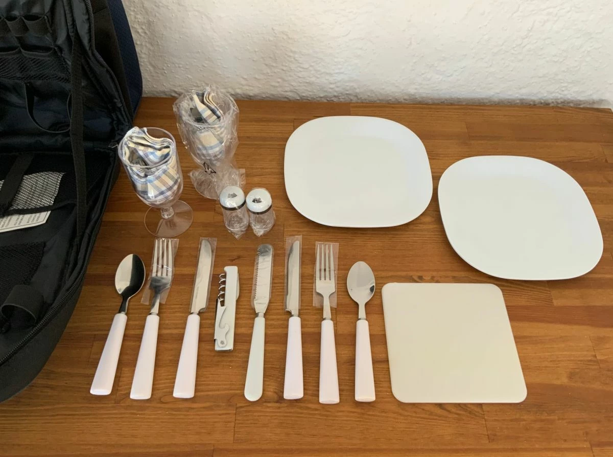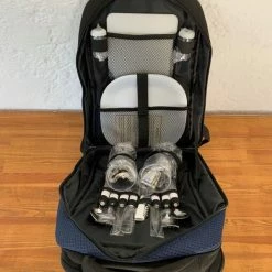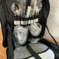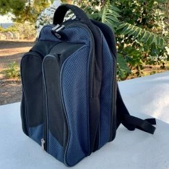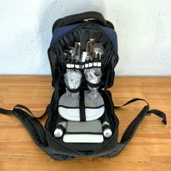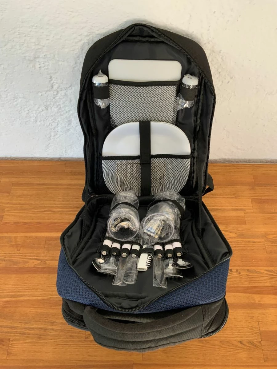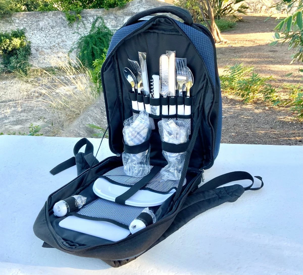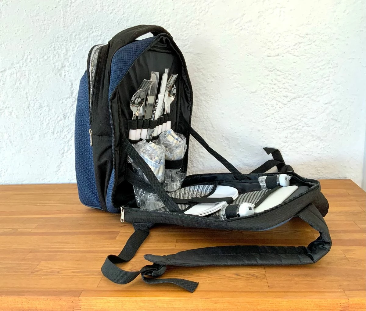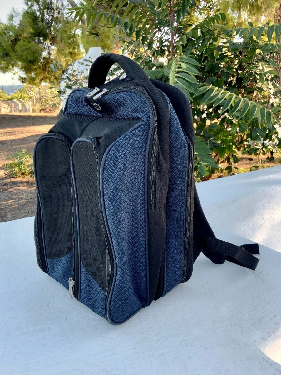 Πρακτικό για πικ-νικ, camping, ταξίδι, πεζοπορία, περίπατο ή βόλτα στην εξοχή με το ποδήλατο. Ένας πλήρης εξοπλισμός για δύο άτομα και παράλληλα μια ισοθερμική τσάντα για ζεστά ή κρύα τρόφιμα και ποτά. Διαθέτει άφθονους χώρους με τρία τμήματα-χωρίσματα για τα τρόφιμα, τα ποτά σας και τα gadget σας. Διαθέτει χερούλι και ιμάντες ώμου για εύκολη μεταφορά. Χρώμα μπλε σκούρο με μαύρα στοιχεία.