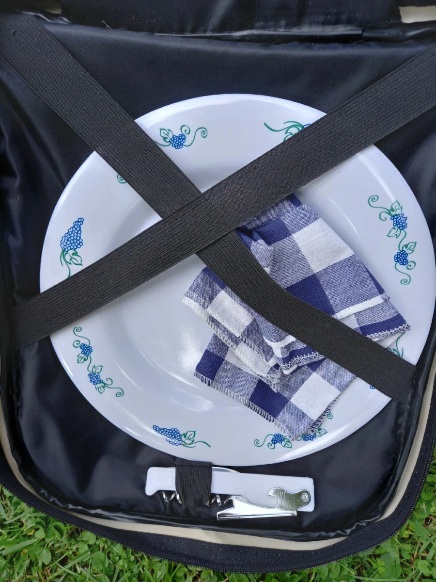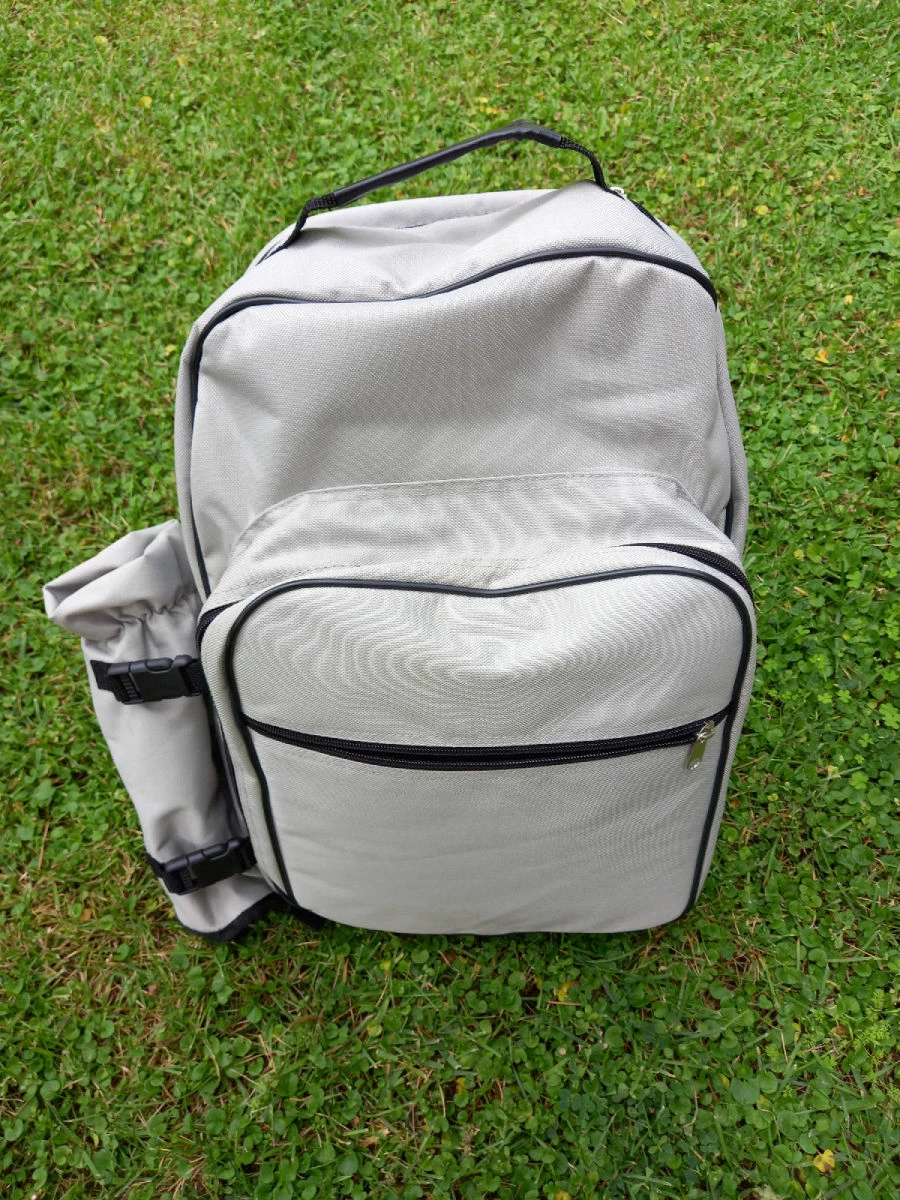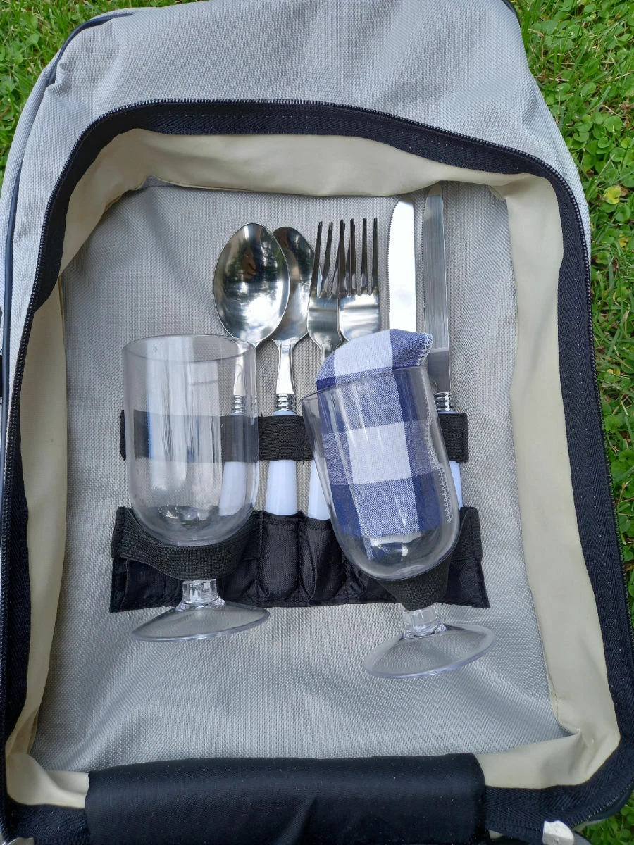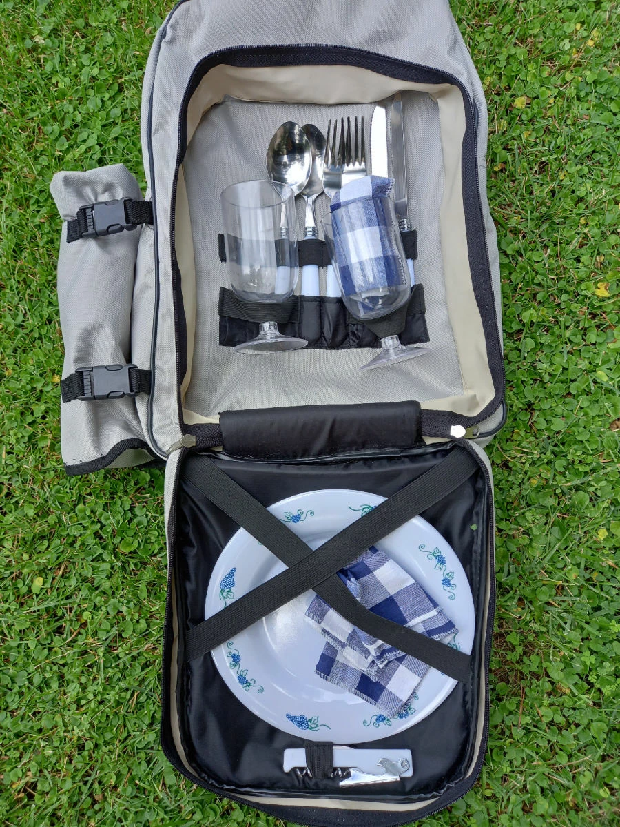 Σακίδιο πλάτης για ταξίδι,αθλητισμό,πικ-νίκ κάμπινγκ κ.α!Εξωτερική θήκη για φιάλη νερού,κρασιού κ.α!Εσωτερικά από δύο πιάτα,κουτάλια, πιρούνι,μαχαίρια,ποτήρια, πετσέτες,τραπεζομάντηλο και ανοιχτήρι!